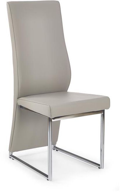 Kaunis ruokatuoli, jossa on moderni muotoilu. Jalusta on valmistettu kromatusta metallista ja istuin on päällystetty erittäin miellyttävällä beigenvärisellä keinonahalla maksimaalisen mukavuuden saavuttamiseksi.