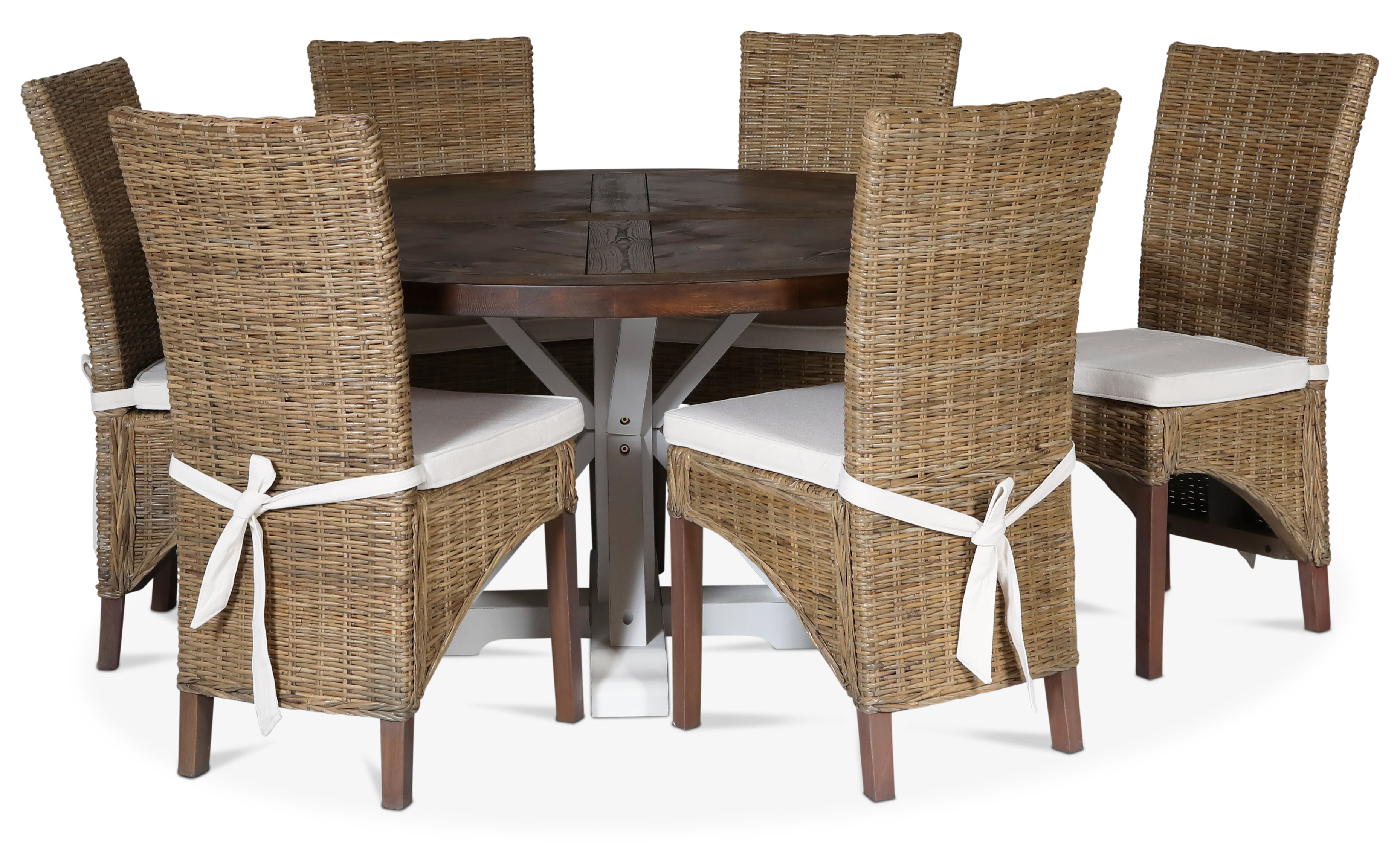 Tuva-ruokailuryhmä Skånska Möbelhusetilta, pyöreä ruokapöytä, ruskeaksi petsattua ajopuuta valkoisella pohjalla. Kuusi Croco-rottinkiruokailutuolia yhteensopivalla tyynyllä.