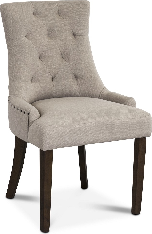 Tuva on tuoli beigellä kankaalla ja antiikkiväritetyillä niiteillä. Ruskeat jalat sopivat täydellisesti yhteen Lamier-ruokapöydän kanssa. Tuoli on todella laadukas ja yksi meidän suosituimmista ruokatuoleistamme.