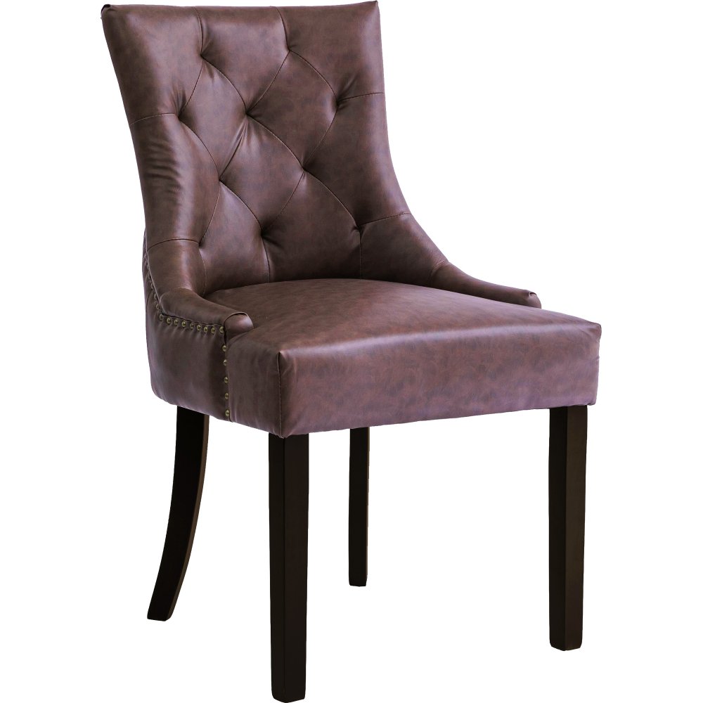 Tuva-tuoli ruskeasta vintage PU:sta yhteensopivilla ruskeilla jaloilla. Upeana yksityiskohtana antiikinväriset niitit. Tuoli on hyvin valmistettu ja on yksi meidän suosituimmista ruokatuoleistamme.