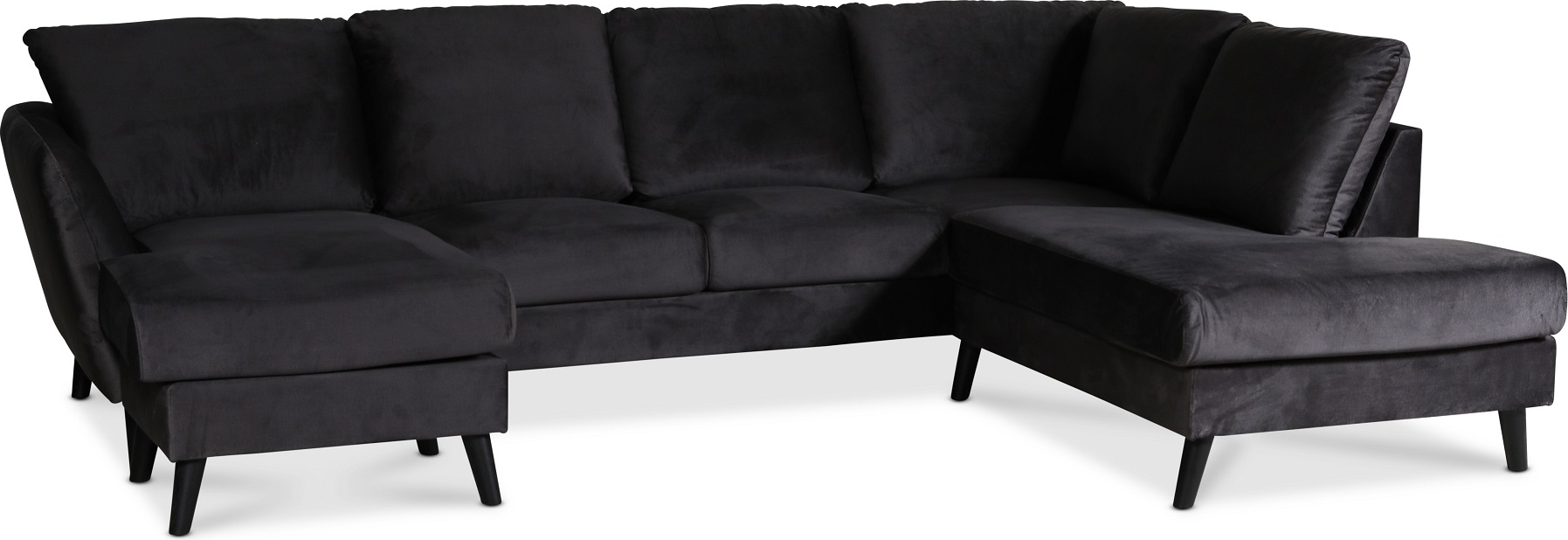 Retro-vivahteinen Country U-sohva avoimella päädyllä on täydellinen sohva moderniin kotiin. Tyylikäs ja korkealaatuinen sohva, josta tulette nauttimaan vielä monta vuotta eteenpäin. Korkealaatuista 35 kg tiheysasteen kylmävaahtomuovia. Helposti sijoitettava sohva pehmeällä ja mukavalla antrasiitinharmaalla samettikankaalla, joka sopii useimpien makuun. Pyöreät ja mustapetsatut massiivitammijalat.