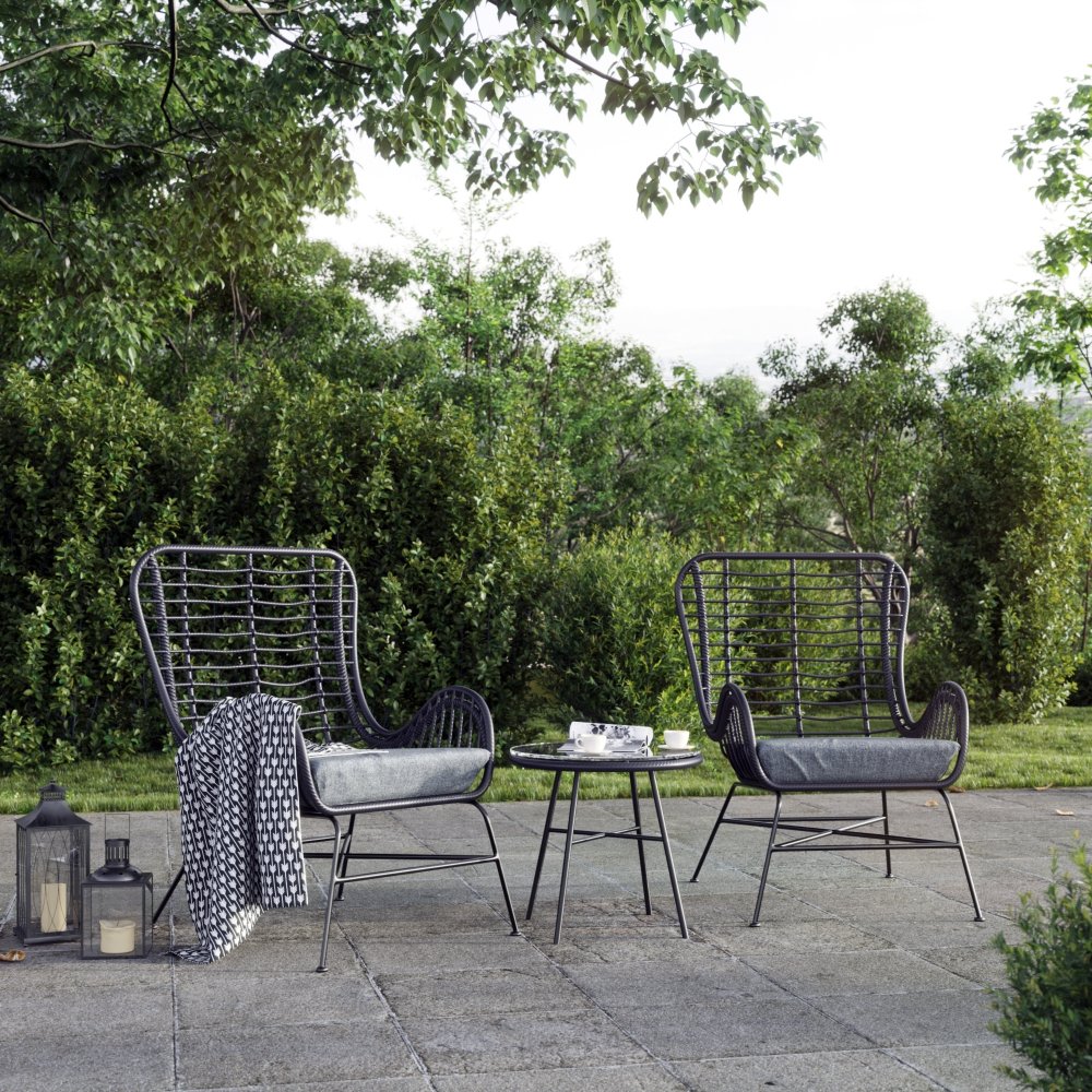 Mukava pieni ulkokalusteiden ryhmä tummasta keinorottinkista, joka sopii helposti muiden huonekalutyylien joukkoon. Huonekaluryhmä koostuu kahdesta rottinkituolista ja pöydästä 5mm lasitasolla.