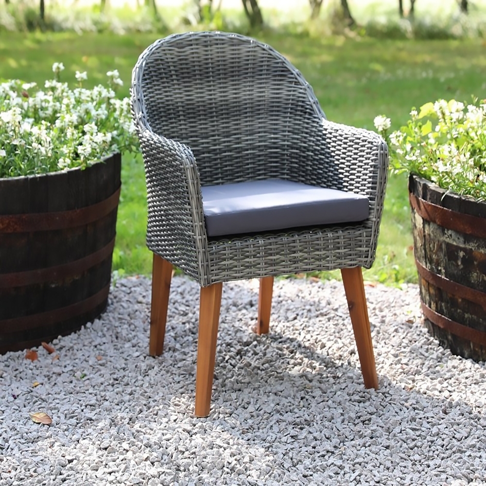 Valetta-nojatuoli Skånska Möbelhusetistä. Sementinväristä rottinkia ja harmaat jalat, istuintyyny tummanharmaa. Sopii täydellisesti ulkopaikalle.