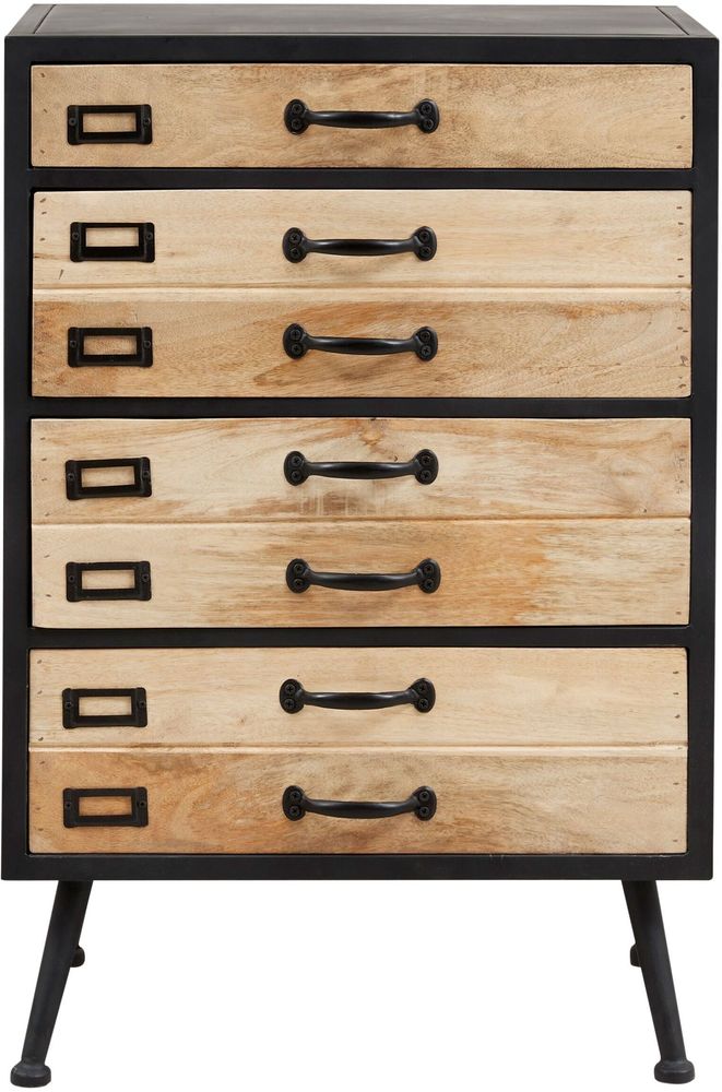 Tyylikäs lipasto, jossa puunväriset laatikot mangopuusta, muuten musta. Kolme isompaa laatikkoa ja yksi pienempi tarjoavat runsaasti säilytystilaa. Metallikehys.