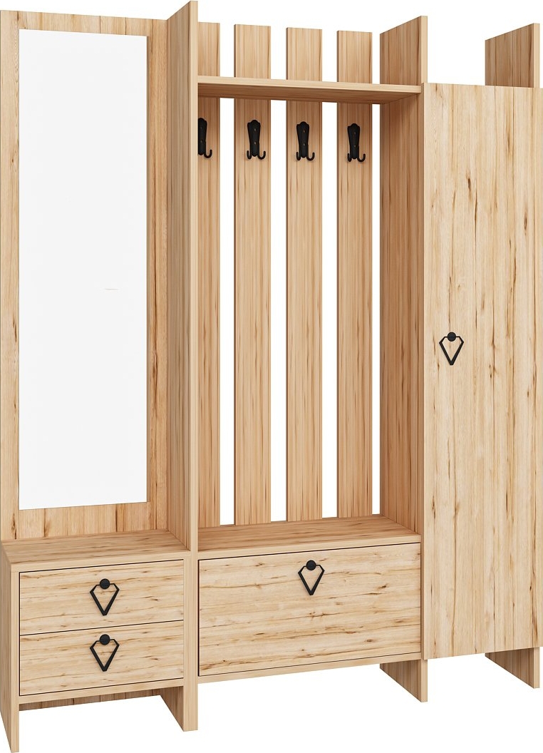 Puusta valmistetut eteisen kalusteet lasipeilillä.