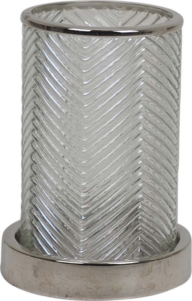 Lasinen lyhty kalanruotokuviolla ja metallijalalla.