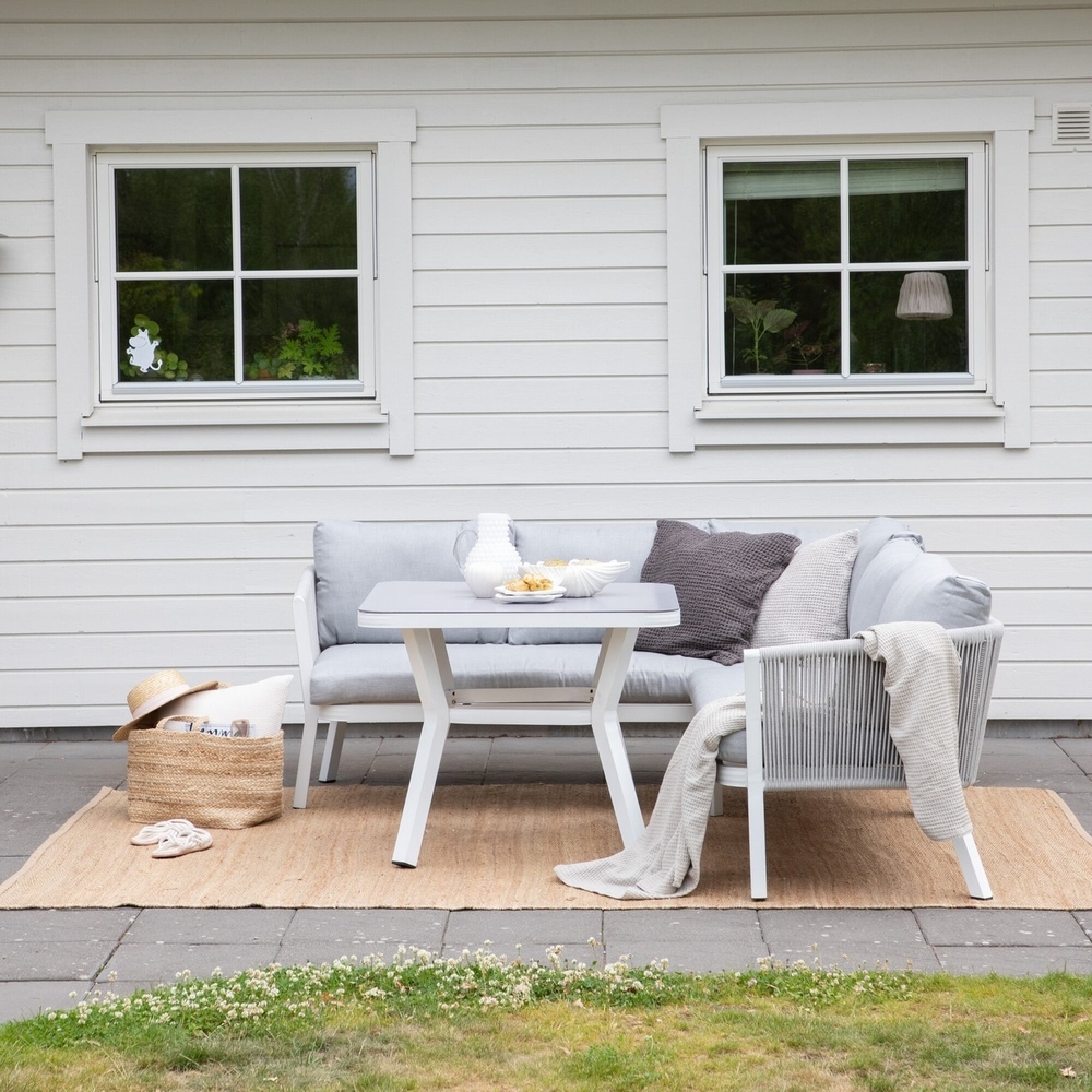 Virya Sofa Group on mukava ja tyylikäs valkoinen alumiiniryhmä, jonka mukana tulee lasitasoinen pöytä. Kestävät tyynyt harmaat ovat mukana ja ryhmässä on yhteensä 5 istuvaa vierasta. Pöydän mitat: 90x90x67 cm. Sohvan mitat: 206x220x71,5 cm. Istuimen mitat: 183,5x65x34 cm. Tarvitaan helpompi kokoonpano. Kutsu perhe ja ystävät viettämään mukavia ja mukavia hetkiä tänä kesänä! Hoito-ohjeet: Alumiinista ja ruostumattomasta teräksestä valmistetut ulkokalusteet tulee puhdistaa säännöllisesti vedellä ja miedolla saippualla. Huuhtele aina huolellisesti runsaalla vedellä, mikä on erityisen tärkeää, jos huonekalut sijaitsevat lähellä merta, jossa suola voi kulkeutua ilmassa.