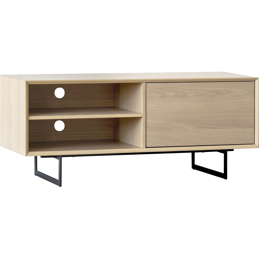 TV-taso valkoiseksi pigmentoitua ja vahalakattua tammiviilua ja musta metallijalusta. Kaappi ja kaksi hyllyä valmiiksi poratuilla kaapelirei'illä.