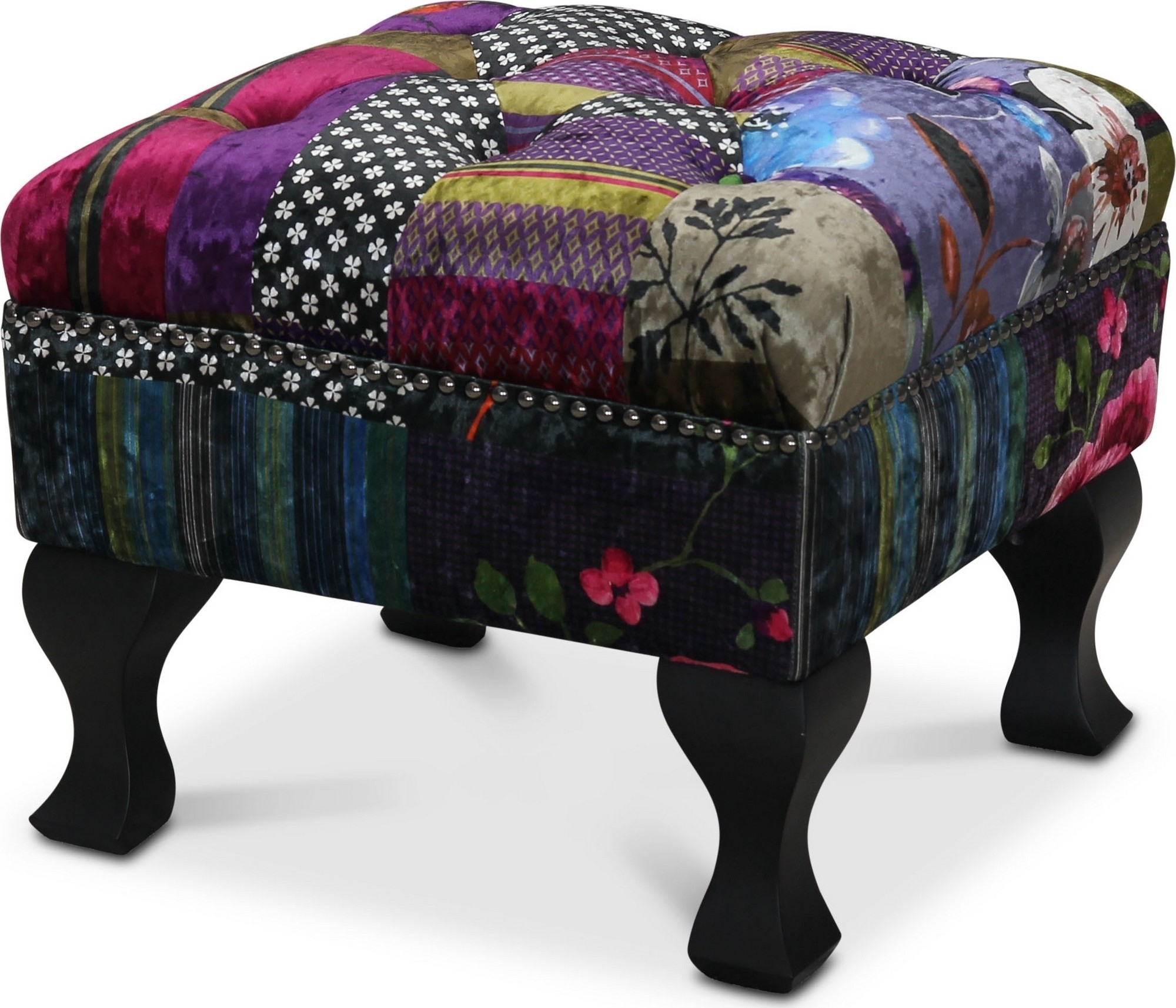 Tilkkutäkkikuvioidulla sametilla verhoiltu rahi. Tämän mallin istuin on pehmustettu kylmävaahtomuovilla ja ytimessä pocketspring-jouset.