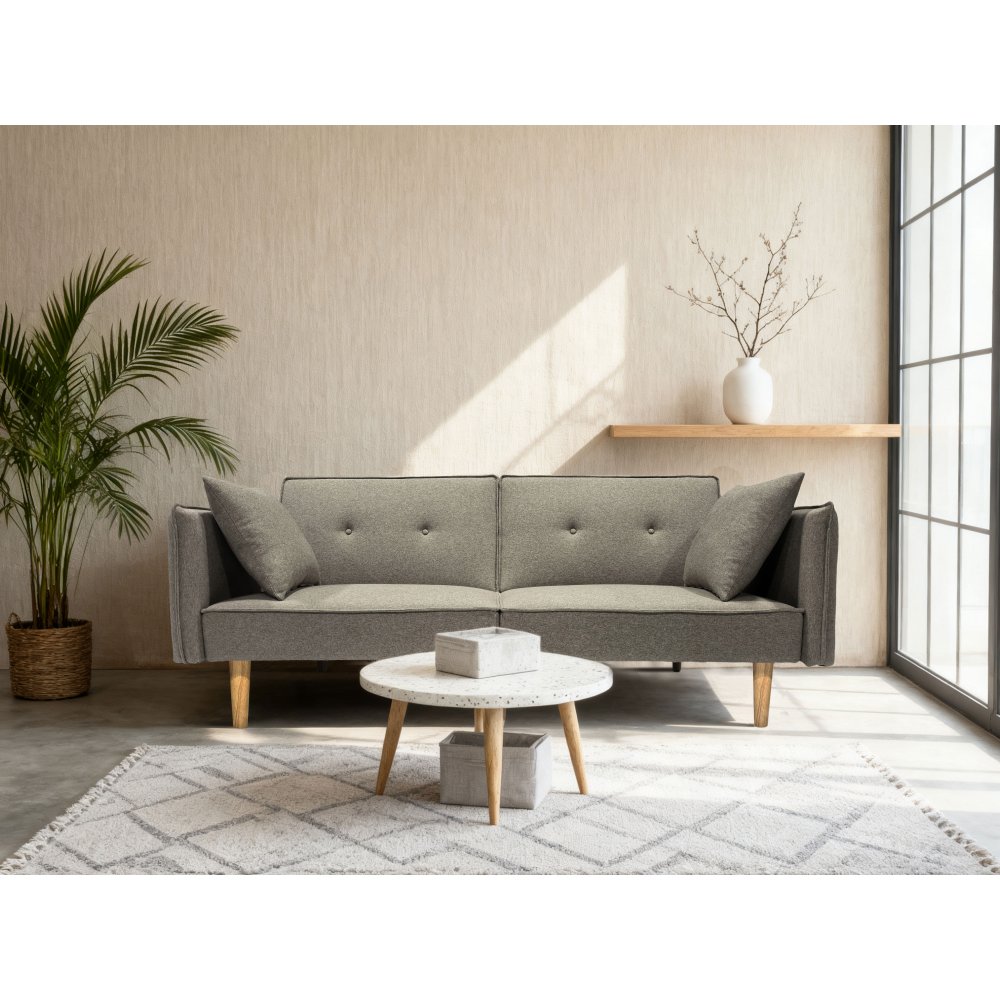 Istuin ja selkänoja on verhoiltu pehmeällä puuvillakankaalla, joka tuntuu mukavalta ja kutsuvalta, ja pinta tuntuu viileältä ja raikkaalta ihoa vasten. Tukevat puiset jalat lisäävät kokonaisuuteen vakautta ja luonnollista lämpöä. Kun on aika levätä, selkänoja taittuu helposti alas ja sohva muuttuu mukavaksi sängyksi - täydellinen sekä arkikäyttöön että yövieraille.