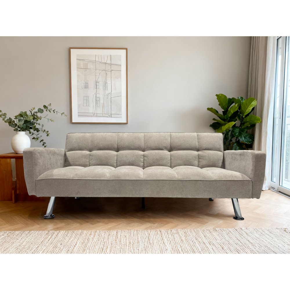 Istuin ja selkänoja on verhoiltu vaahtomuovilla tasaisen mukavuuden takaamiseksi, ja sohvan kromatut metallijalat antavat modernin ilmeen ja ovat samalla vakautta. Vankan rakenteensa ansiosta sohva tuntuu vakaalta sekä istuen että makuuasennossa.