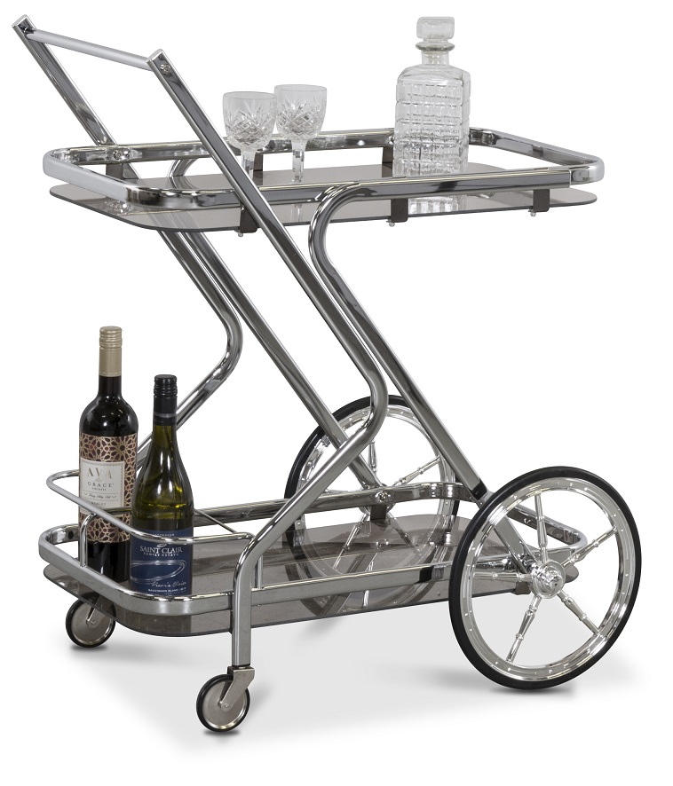 Klassinen tarjoiluvaunu kromatulla metallilla. Hyllyt savunväristä lasia.