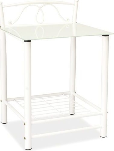 Tyylikäs yöpöytä klassisella designilla. Runko on valmistettu valkoisesta metallista ja se on varustettu käytännöllisellä hyllytasolla, jossa voi säilyttää esimerkiksi kirjoja ja lehtiä. Pöytälevy on valmistettu karkaistusta lasista.