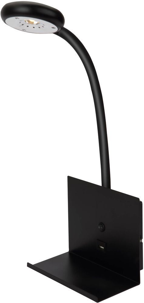 Yövalaisin mustalla designilla. Kiinnitetään helposti seinään. USB-liitäntä ja hylly laitteiden latausta varten.